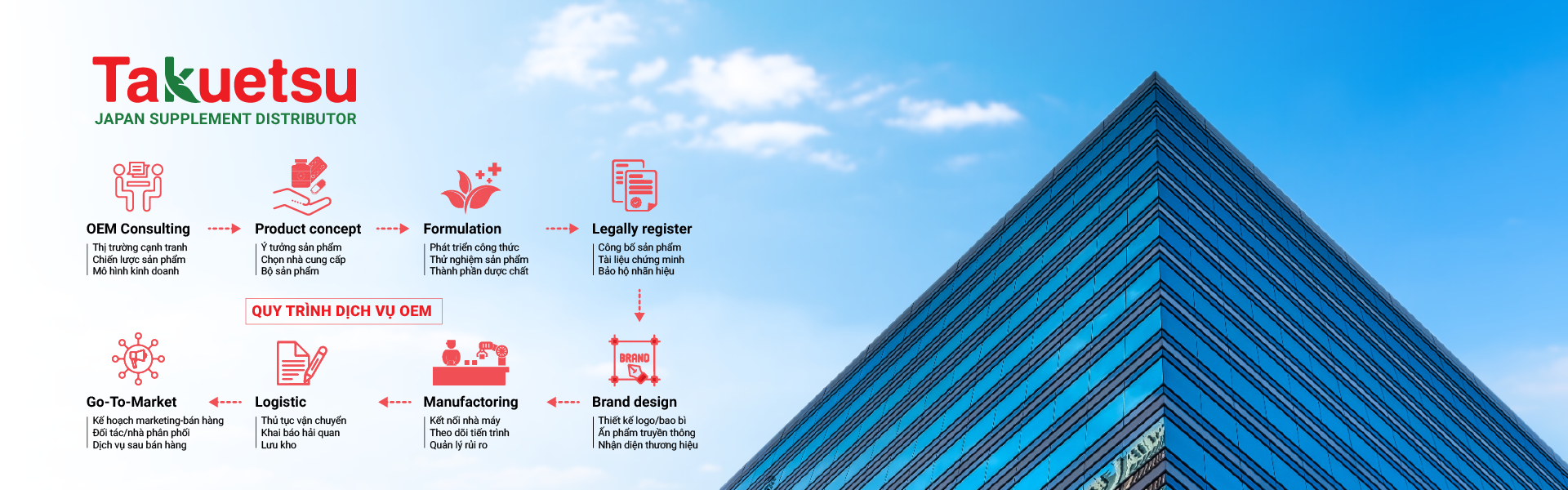 Chúng tôi mong muốn được hợp tác, tư vấn và kết nối với các Doanh nghiệp có nhu cầu phát triển dòng sản phẩm nhãn hàng riêng (OEM/ODM). Dịch vụ của Takuetsu Pharma giúp cho khách hàng từ: Phát triển ý tưởng/công thức sản phẩm, chiến lược dòng sản phẩm, thực hiện pháp lý, quản lý và sản xuất, tư vấn kế hoạch bán hàng và chiến lược thương hiệu nhãn hàng riêng (OEM/ODM) phù hợp với nhu cầu khách hàng tại thị trường Việt Nam.